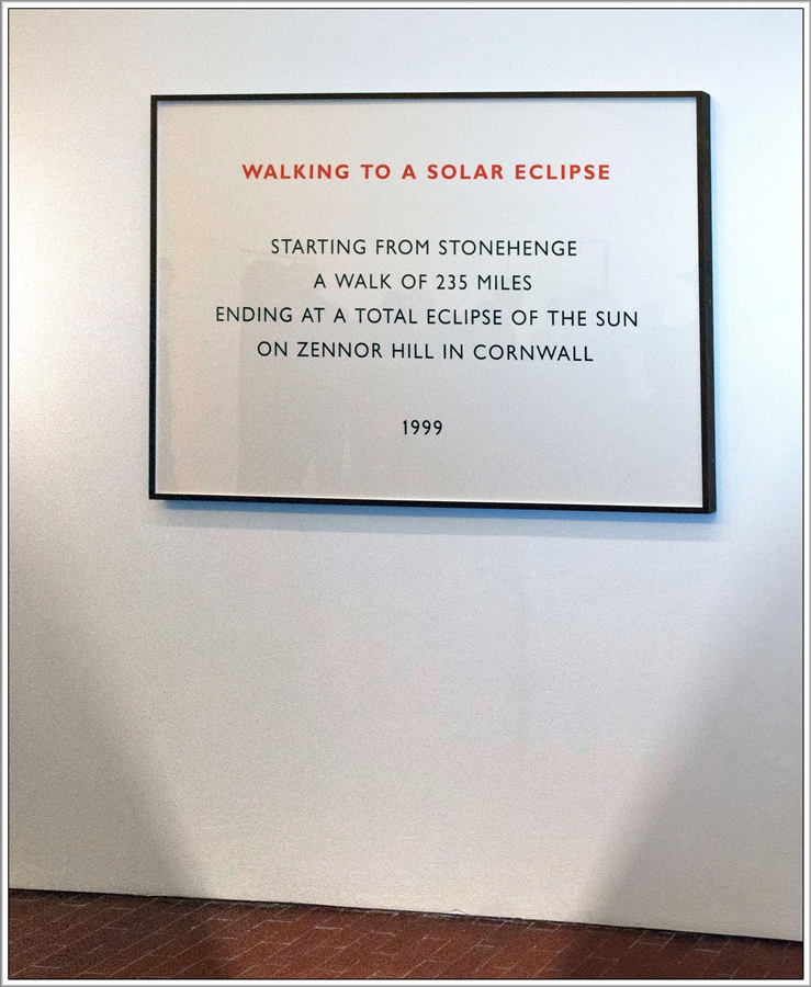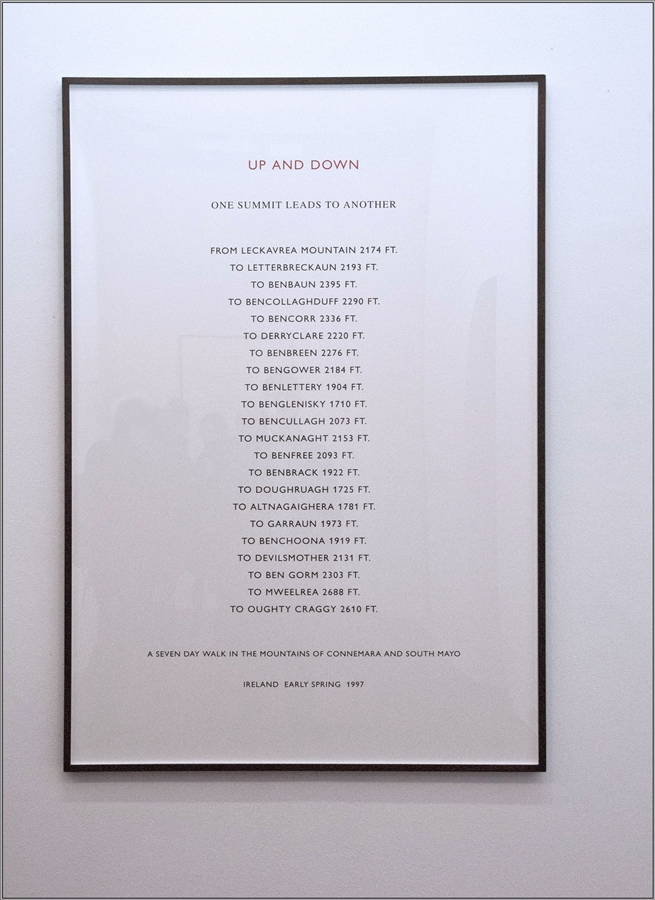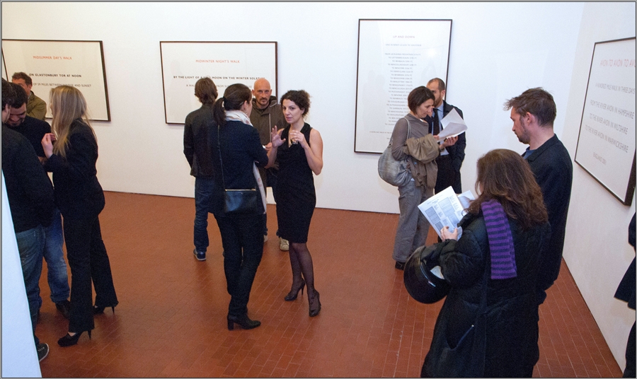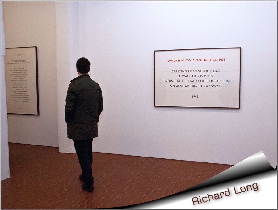 Undici text work, appesi nell’accogliente ed ampio salone, raccontano le camminate compiute negli ultimi 22 anni in Inghilterra, Francia, Italia, Grecia, Irlanda e Sud America. Un resoconto dettagliato, composto da brevi locuzioni, i cui singoli vocaboli sono accostati perseguendo una ricerca accurata. Lavori linguistici assimilabili a componimenti poetici, interessanti dal punto di vista formale, nati con l’intento di trasportare mentalmente lo spettatore nel sito narrato. L’evocazione delle lande desolate fa rivivere nel fruitore le sensazioni provate dallo scultore, fino all’immedesimazione e l’identificazione del pubblico nell’autore e quindi nell’opera d’arte stessa.