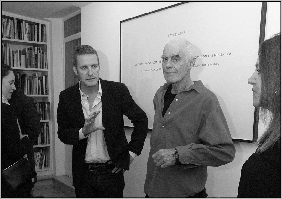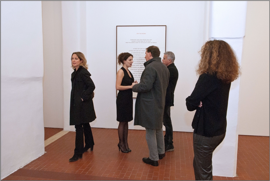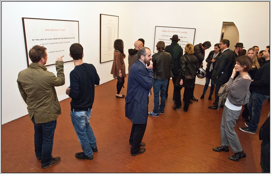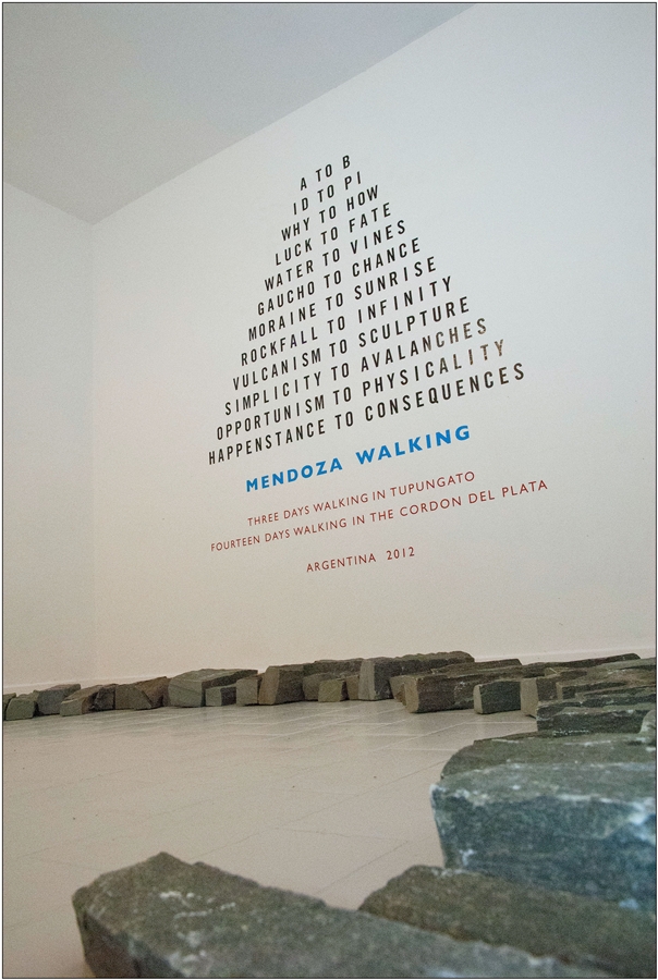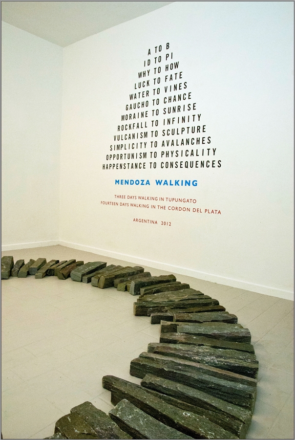Nel 1969 il britannico espose il primo text work nella celebre rassegna concettuale When Attitudes Become Form curata da Szeemann alla Kunsthalle di Berna. Da allora, ha continuato ad elaborarne molti altri fino al recente Mendoza Walk, riferito all’ultima passeggiata effettuata in Argentina. Presso l’esiguo spazio dello Street View il componimento testuale, applicato direttamente sulla parete, è accompagnato dall’installazione site-specific Trastevere Spring Circle (pietra di serpentino italiano, 2012) costituita da un cerchio di pietre longitudinali posizionate sul pavimento bianco. La scelta di custodire l’opera in questa sorta di teca, inaccessibile al pubblico e visibile solo dall’esterno, amplifica la sua bellezza e la sua aura.