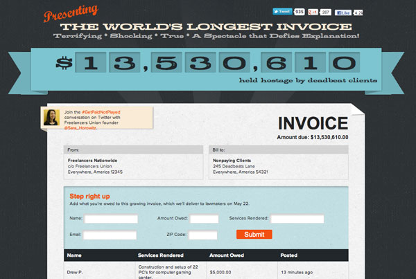 Ribellarsi a questo meccanismo, ormai radicato all’interno di ogni nazione per così dire civilizzata, sembra impossibile ma negli Stati Uniti ci stanno perlomeno provando. Una piattaforma, The World’s Longest Invoice (la fattura più lunga del mondo), ha infatti iniziato a raccogliere le testimonianze dei lavoratori freelance americani che non sono mai riusciti a farsi pagare per i loro servigi.  C’è chi ha fatto un sito web, chi ha curato gli effetti speciali per un film e chi ha lavorato in uno studio di registrazione. La caratteristica che accomuna questi lavoratori è sempre la stessa: non sono stati mai pagati. I lavoratori che arrivano sul sito possono immettere l’importo del loro pagamento, questo va a sommarsi con quello degli altri lavoratori. Ad oggi, la fattura più lunga del mondo ammonta a circa 16 milioni di dollari e l’obiettivo della piattaforma è raccogliere quante più testimonianze possibili per presentare poi il conto all’agenzia delle entrate locale.
