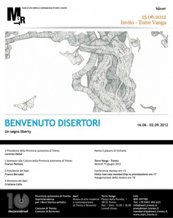 Cinquanta di queste opere sono ora al centro della mostra “Benvenuto Disertori. Un segno Liberty”, a cura di Alessandra Tiddia, in programma dal 16 giugno – 2 settembre 2012 nella sede di Torre Vanga a Trento. Affiancata da un catalogo con testi di Andrea Disertori, figlio dell’artista, di Duccio Dogheria e di Alessandra Tiddia, la mostra si concentra in particolare sull’attività di ritrattista di Disertori; accanto alle incisioni saranno esposte per la prima volta una selezione di matrici xilografiche, e in rame e zinco, relative alle opere presentate e un nucleo di disegni inediti provenienti dalla collezione di famiglia. Inoltre, nel catalogo della mostra il Mart pubblica la lista completa delle opere di Disertori presenti nelle proprie collezioni, per offrire un essenziale strumento di approfondimento agli studiosi. La mostra