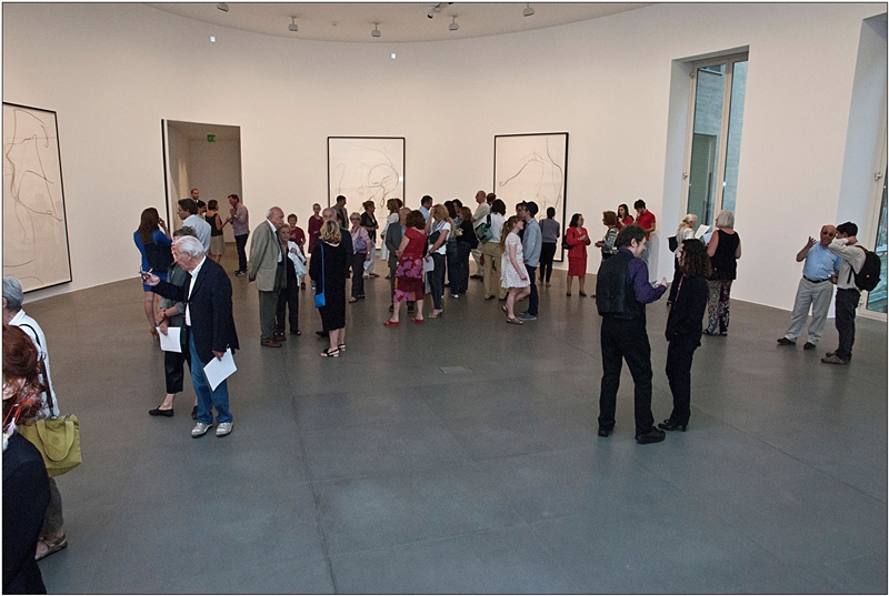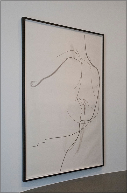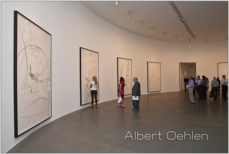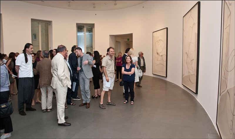 Le colonne in stile corinzio dell’entrata ricordano la facciata di un tempio greco, anticipando le ampie dimensioni dei suoi interni, dove i recenti disegni di grande formato (300x200cm) del tedesco sono dislocati nei tre ambienti in cui è suddiviso lo spazio. Nella sala ovale, un vasto openspace caratterizzato da un soffitto altissimo e da una serie di finestroni, che invitano l’occhio del fruitore ad osservare il palazzo adiacente, sono distribuiti su una parete bianchissima sei dei nove carboncini su carta presentati per l’occasione.
