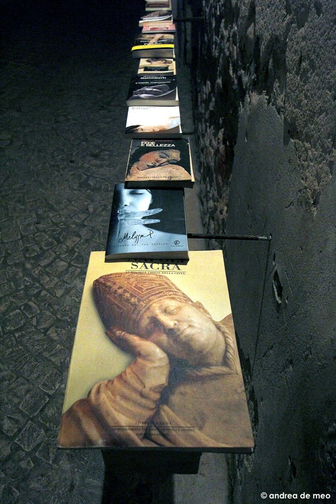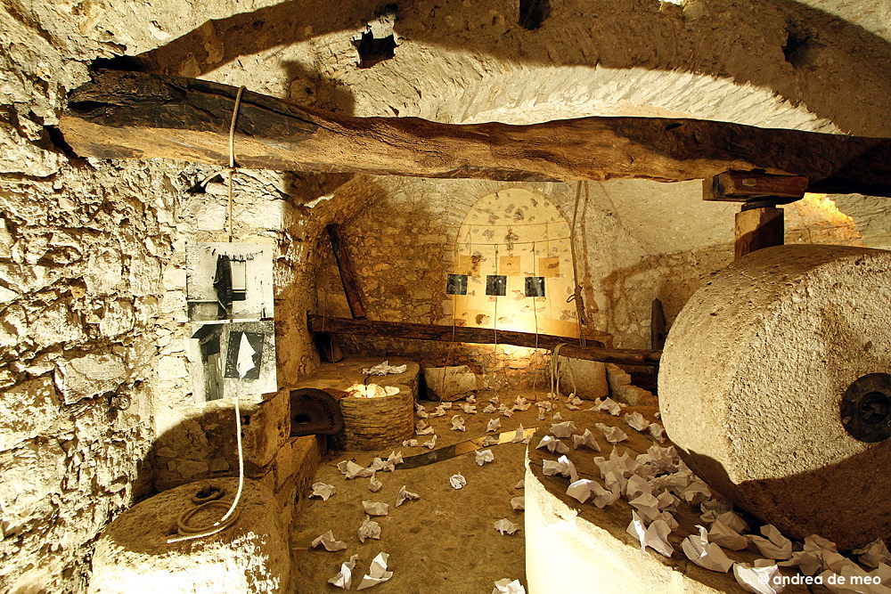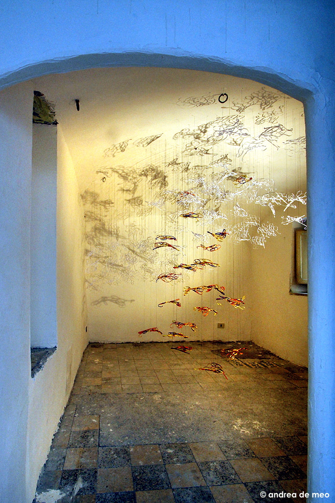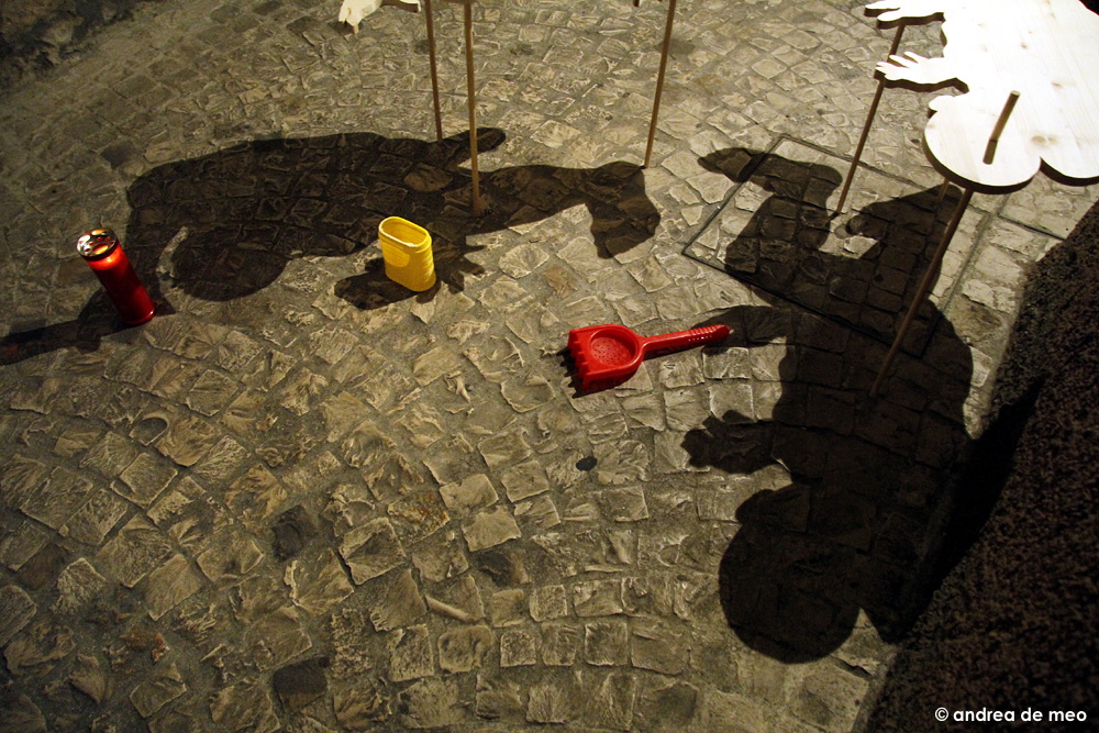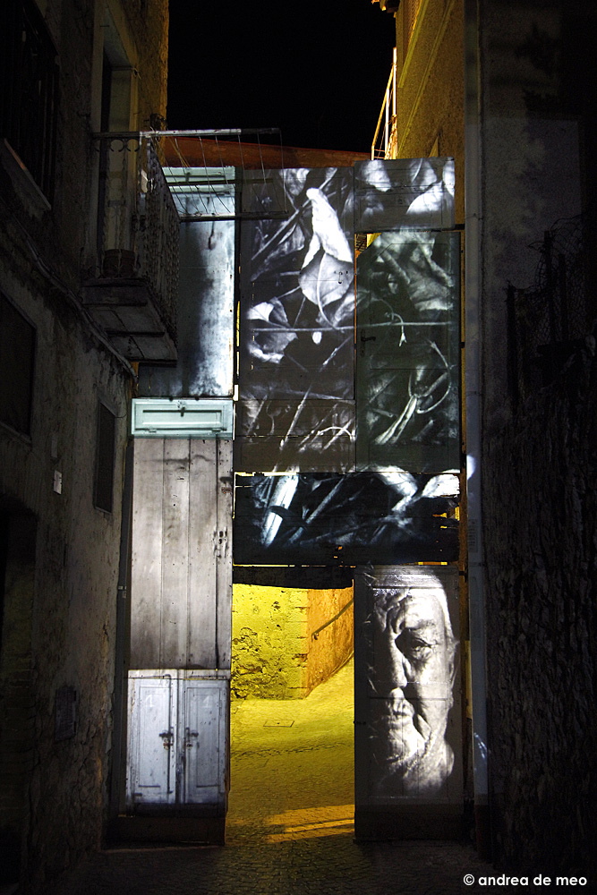 Di forte impatto emotivo è risultato l’intervento dello scenografo romano Daniele Spanò (Roma, 1979): un’architettura di porte che trasformano l’abituale scorcio dei vicoli per dar vita ad un muro, un ostacolo su cui è proiettato un filmato straniante dove inquietanti facce si alternano ad usci che sbattono. Oltrepassata l’unica piccola apertura dell’imponente impalcatura, il passante entra in una nuova dimensione, dove è inconsapevolmente tramutato da astante ad attore poiché è preso in giro da due bambini seduti su un balcone che mangiano pop-corn mentre si gustano lo ‘spettacolo’ sottostante. E’ il ‘Cinema all’aperto’ di Chiara Mu (Roma, 1974), una dissacrante performance ideata per sovvertire la consueta presenza, nel piccolo centro abitato, dello sguardo sentenzioso delle silenziose vecchiette affacciate sui ballatoi domestici. Mentre, in ‘La via d’uscita’ la romana installa, all’interno di un tunnel buio e disabitato, cinque paia di scarpe (taglia bambino/adolescente) sparse sul pavimento, uniche presenze esistenti e simbolo di giochi e corse selvagge fatte negli anni ’60-’80 dai bambini che abitualmente lo attraversavano per accedere al giardino oggi inaccessibile. In netto contrasto con questa dimensione evocativa è la registrazione audio composta da inquietanti schiamazzi infantili che riecheggiano in tutto l’ambiente. Un alone di mistero percorre il breve e desolato percorso culminante in una parete buia delimitata solo da lanterne illuminate che evocano domande dalle risposte insolute.