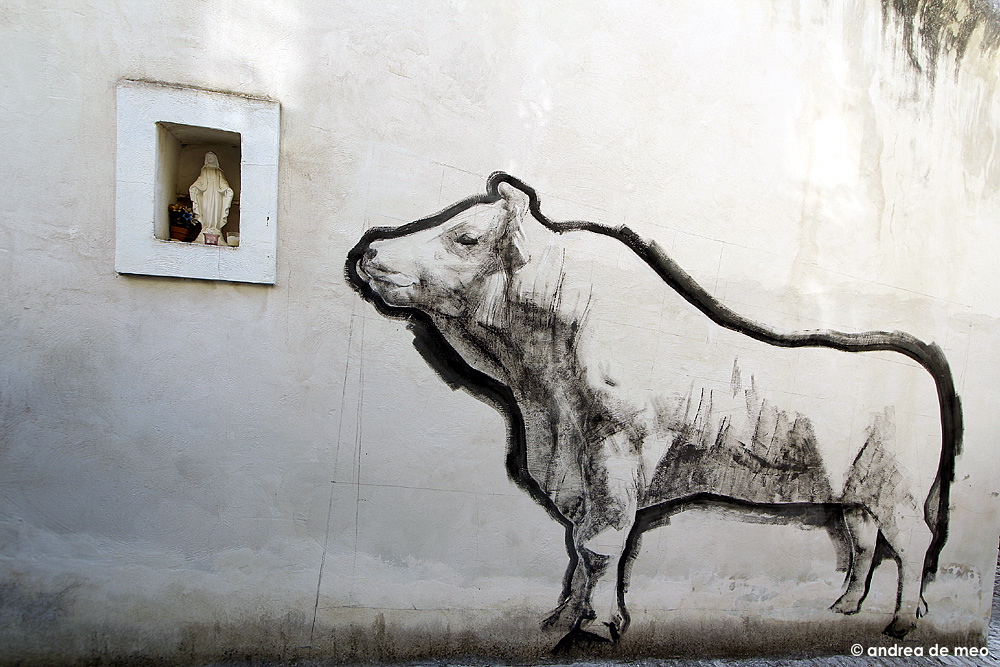 Lo spagnolo Pablo Mesa Capella (1982, Malaga), interessato al tema della memoria, ha decorato l’esterno di un edificio diroccato con antiche fotografie trovate nei mercatini d’antiquariato. L’istantanea, collegandosi a remoti ricordi, diventa l’unica traccia di una vita umana scomparsa. Completano il suo intervento la serie apparecchi acustici ed immagini fotografiche, disseminate lungo il cammino, che raccontano intime vicende degli abitanti.