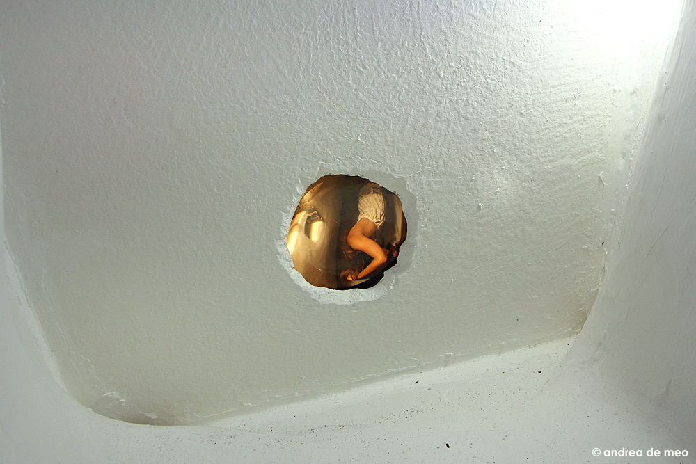Giocando con i meccanismi della percezione ed utilizzando particolari lenti ottiche, Marco Di Giovanni (Teramo, 1976) capovolge la consueta visione di ciò che accade all’interno dei luoghi. Per l’occasione ha presentato filmati in cui i protagonisti mutano rispetto al loro aspetto quotidiano, rifacendosi a quelle alterazioni fisiche che spesso ricorrono nei nostri incubi.