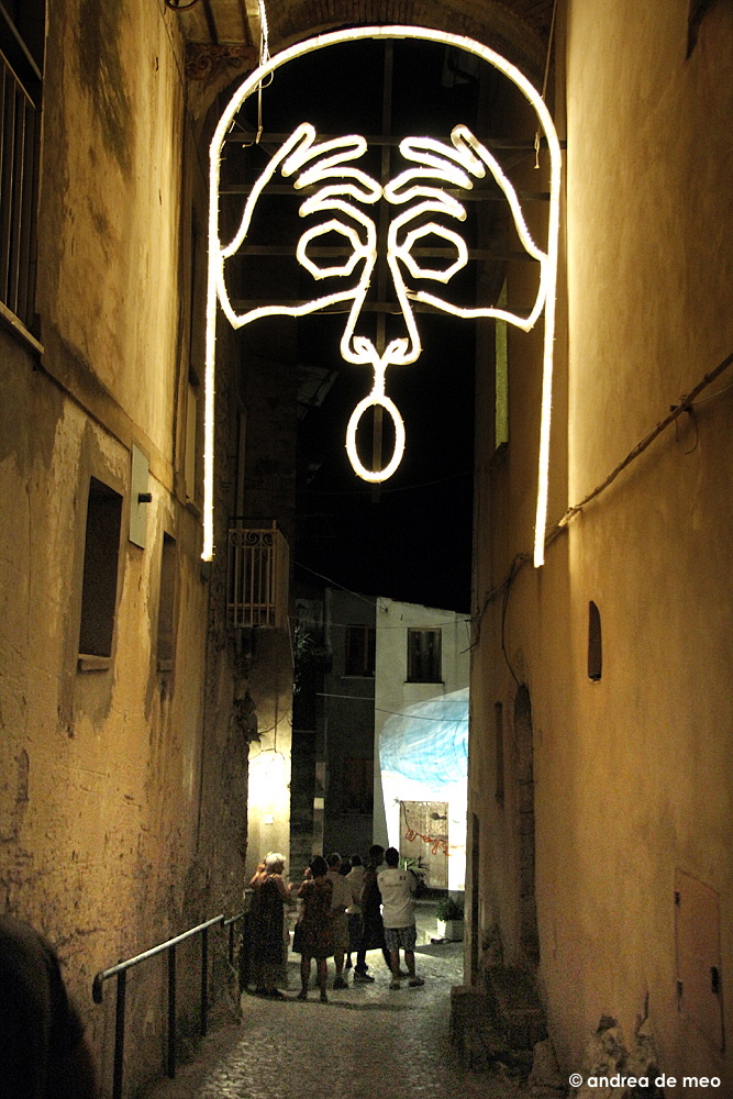 Conclusa la perfomance inaugurale lo spettatore è invitato ad esplorare il lungo tragitto che, partendo dallo storico poggio su cui sono adagiati i colorati merletti, cuciti dalle vecchiette del luogo, dell’installazione di Angela Zurlo (1982, Troia – FG), si concluderà alla Torre Cajetani, sede degli eventi collaterali. Oltrepassata la sfilata di attori in veste notturna, che offrono all’astante la possibilità di adagiarsi sul loro cuscino al fine di addormentarsi e sognare, si giunge alle lignee silhouette umane di Carlo De Meo (1966, Maranola – LT). Collocate ai margini di una stretta via ed illuminate da spoglie lampadine, tali sagome generano ombre misteriose che afferrano oggetti reali, apparentemente dimenticati da qualche distratto paesano. Poco più avanti, sotto ad un’arcata, l’attrice Giulia Ledda intrattiene decine di persone incuriosite dalla sua vivace esibizione. Girato l’angolo lo sguardo è attratto dall’installazione luminosa di Valeria Crociata (Roma, 1978) caratterizzata da una linea continua ed essenziale che, attraverso un semplice gesto delle mani, riproduce il volto di un osservatore sbigottito. Sorprendente è stata la performance di Cecilia Viganò (Carate Brianza, 1982) che, seduta al proiettore, ha improvvisato una serie di Live Painting – da lei definiti semplicemente come ‘Disegni su lavagna luminosa’ – alternando l’uso dei consueti strumenti del mestiere con materiali locali ed elementi naturali. Opere nate grazie alla perfetta sintonia stabilitasi tra la sua immaginazione e ciò che succede intorno a lei.