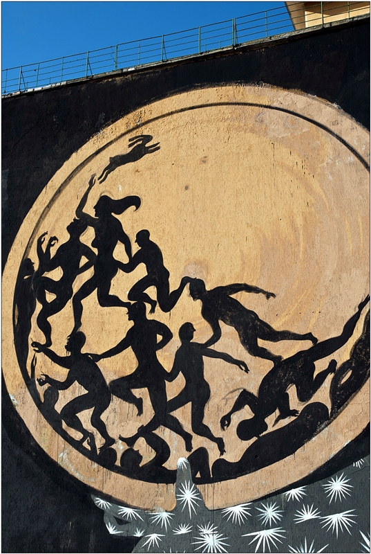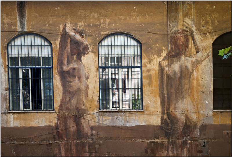 Via Ostiense 206 è l’indirizzo della seconda location dove, dal 20 al 24 Luglio, il giovanissimo BORONDO ha dipinto affusolati nudi umani attraverso l’impiego di tinte monocrome che si amalgamano alla perfezione con l’edificio ocra su cui sono realizzate. Corpi su cui è possibile osservare ogni singola pennellata posta sulla parete. Un tratto distintivo che denota la padronanza di molteplici tecniche artistiche, che vanno ben oltre quelle tipiche dell’urban art, consentendogli di giungere a risultati strabilianti che incantano l’ignaro passante.