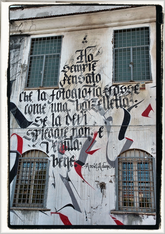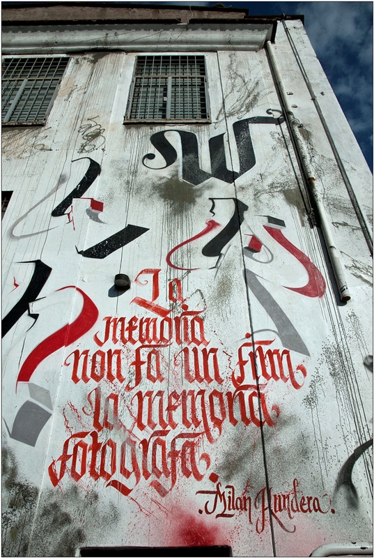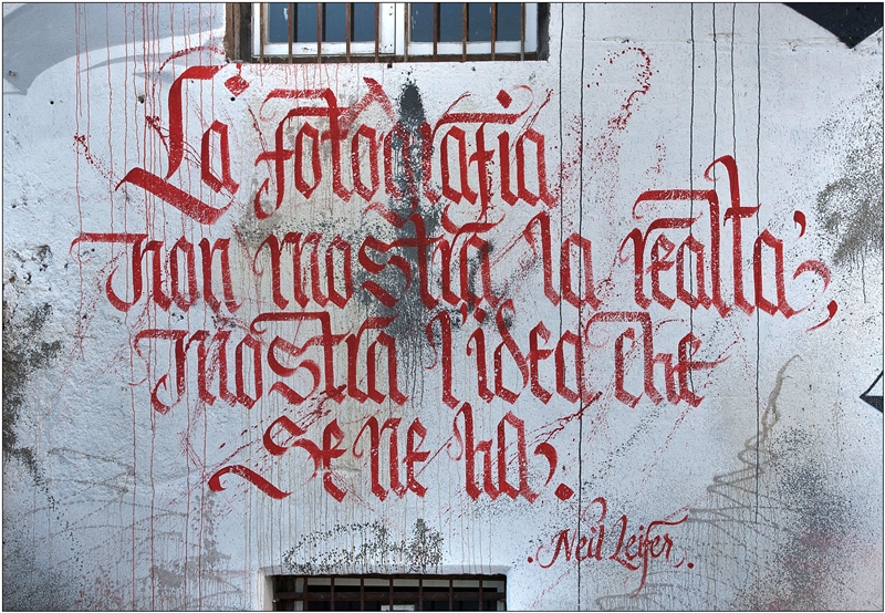 Brus nasce a Roma nel 1982, dove nel 2001 ha iniziato la sua carriera di writer. Da allora ha viaggiato instancabilmente per dodici anni tra varie capitali europee (Berlino, Copenaghen, Barcellona, Parigi, Londra) fino ad approdare a New York, registrando numerosi consensi da parte del pubblico internazionale. La sua ricerca diverge fortemente dall’indagine formale degli artisti sopradescritti in quanto si basa prettamente su un accurato studio della calligrafia: spaziando dai caratteri di tipo gotico a quelli più moderni e tipici della tipografia attuale e lavorando sia su micro sia su macro formati. Il particolare progetto ideato per l’occasione è caratterizzato da una serie di aforismi di famosi fotografi, come Niel Leifer, o letterati, come Goethe o Milan Kundera, inerenti l’immagine fotografica. L’impiego di tinte essenziali (bianco, nero, rosso e grigio) si concilia ed compensa con la ricercatezza della scrittura gotica. In tale lavoro, i diversi idiomi di fotografia e scrittura, posti a confronto, si completano a vicenda come afferma lo stesso curatore Simone Pallotta: “Se la fotografia è immagine e riproduzione della realtà, la parola suggerisce pensieri ed idee senza doverli riprodurre, arrivando a creare immagini direttamente dentro di noi, in modo automatico. Parlare di fotografia e al contempo riprodurre queste immagini attraverso la scrittura è una ricerca di unità tra ancestrali urgenze comunicative: parlare, scrivere e raccontare immagini.” http://www.facebook.com/Brus.Magic