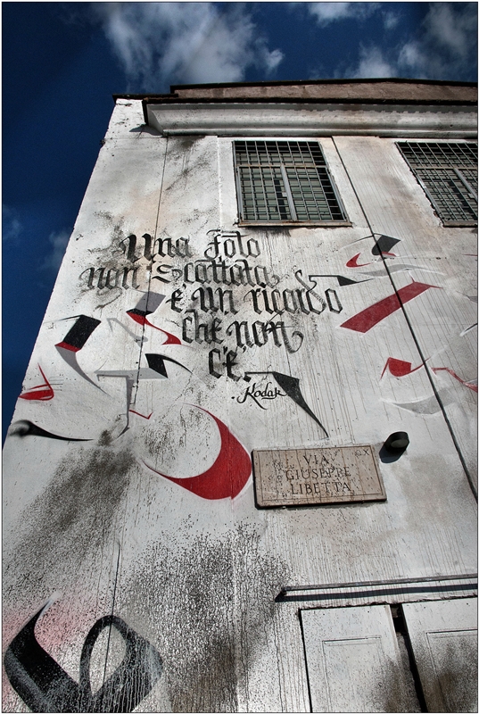 Completa il tour l’ultimo lavoro sito in via Libetta 1, ovvero presso l’edificio in cui risiede ‘Officine Fotografiche’, spazio che ha permesso la realizzazione dell’ultima tappa di OUTDOOR ed il party finale. La facciata esterna del medesimo stabile è stata completamente trasformata grazie all’intervento, dal 06 al 12 Settembre, di BRUS. Il romano ha ideato un opera site-specific in linea sia con il suo stile calligrafico imperniato nel puro writing, sia con la funzione specifica esercitata all’interno dello stesso immobile, in quanto ‘Officine Fotografiche’ è un’associazione culturale no profit nata per divulgare e sostenere la cultura dell’immagine.