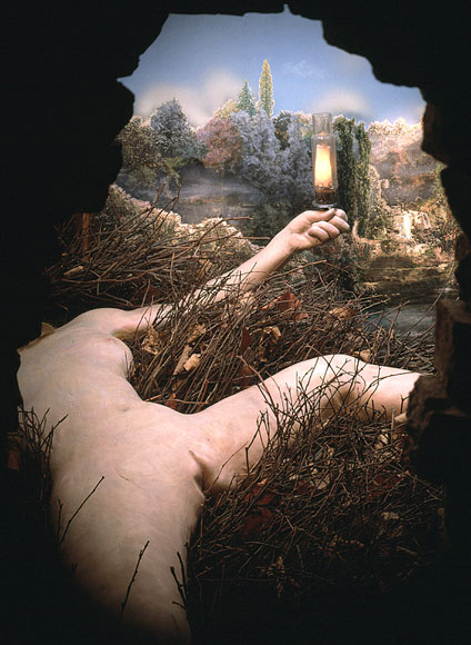 Duchamp aveva infatti creato un’installazione costituita da un diorama in 3-D, in sostanza l’osservatore doveva guardare attraverso due spioncini posti su di una porta montata sul muro di una galleria poco illuminata. Attraverso gli spioncini era possibile ammirare un paesaggio campestre e la figura di una donna in tanga a gambe aperte stesa su una pila di rami e con in mano una lampada a gas. Concludendo, se la prossima volta che ammirate un nudo sarete mossi da piccanti desideri non preoccupatevi… è del tutto normale!!