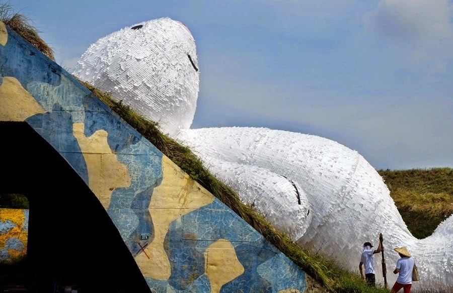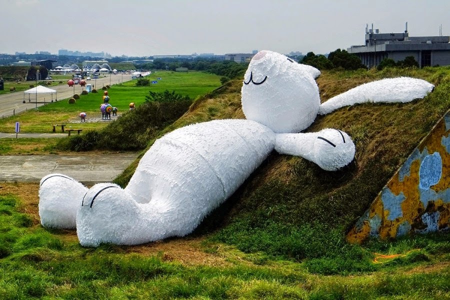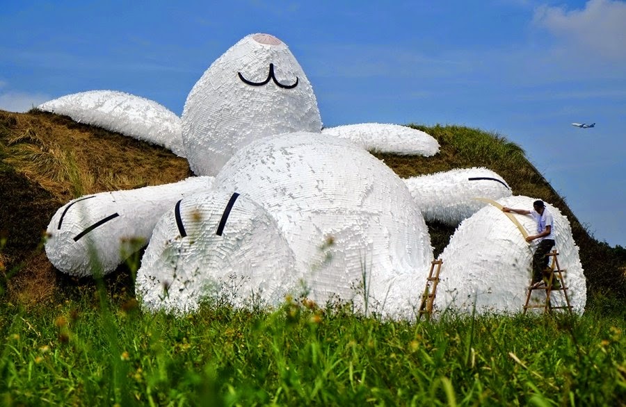 Florentijn Hofman ne ha combinata un’altra delle sue. Il rocambolesco artista è ora a Taiwan dove ha da poco svelato questa spassosissima installazione per il festival d’autunno. La scultura, ispirata alla mitologia cinese, prende il titolo di Moon Rabbit ed è totalmente realizzata in legno, rivestito con carta impermeabile.