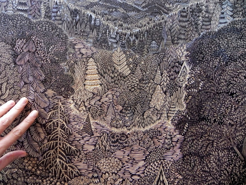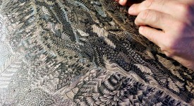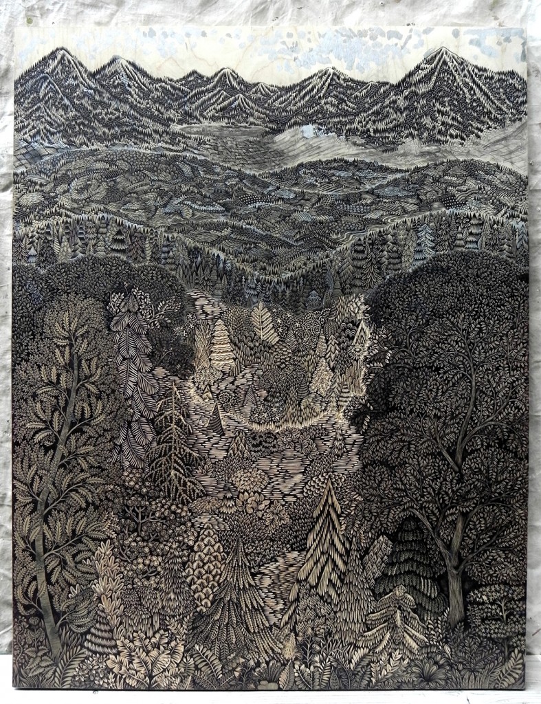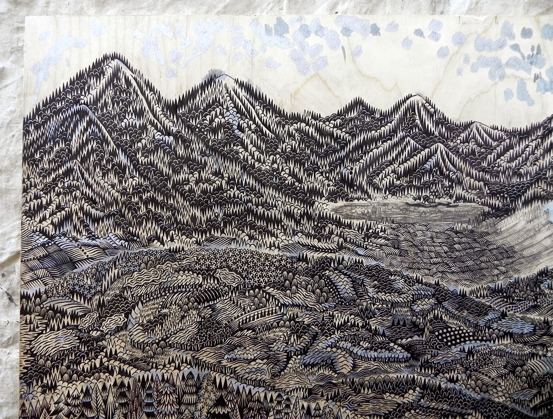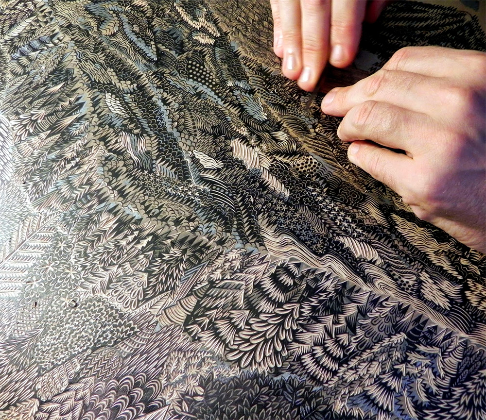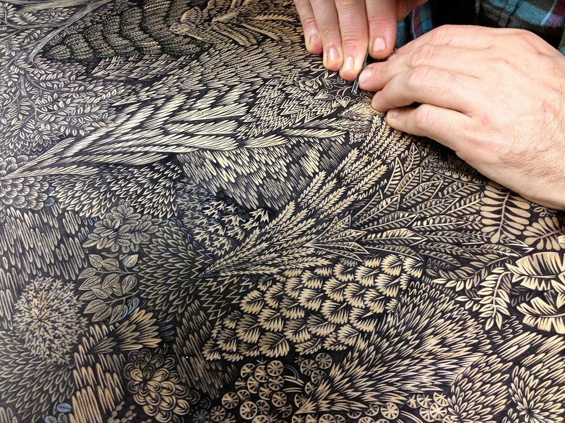 Dopo due anni di meticolosi intagli, l’opera Overlook può finalmente vedere la luce. I suoi “genitori” Paul Roden e Valerie Leuth hanno infatti completato la serie di stampe che costituisce il corpus dell’opera.