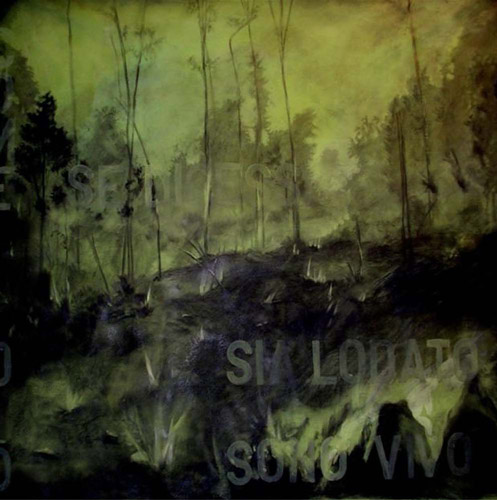 Riunisce la materia, terre colorate impastate, spennellate; le convoca sulle pareti fino a farle lievitare. Non allestisce una mostra con quadri, sfida i materiali; è la duttilità del segno che parla, del gesto, che avvolgerà, che stratificherà. Una storia strettamente personale, si snoda così sui muri attraverso una reazione alcune volte gioiosa, altre volte sofferta, perché nei suoi paesaggi c’è la malinconia, la goia, l’amore, la passione. Come un diario è spesso fiduciosa ma anche drammatica e movimentata, come far scorrere per un attimo una tenda e scoprire una luce, un’ombra, un alba, un crepuscolo.