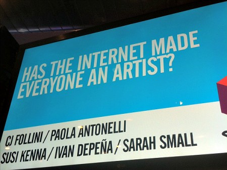In questi giorni si è tenuta l’Internet Week, kermesse newyorkese tutta dedicata alla scoperta e alla valorizzazione delle arti digitali. Tra i panels presenti alla manifestazione, uno in particolare ci è sembrato alquanto interessante, vale a dire quello intitolato Has The Internet Made Everyone an Artist? (internet ha trasformato tutti quanti in artisti?). La discussione si è tenuta mercoledì ed è stata moderata da CJ Follini, co-fondatore di welcometoCOMPANY.com, Paola Antonelli, curatore del MOMA, gli artisti Ivan Toth Depena e Sarah Small e Susi Kenna direttore di Contemporary Art for Excursionist.