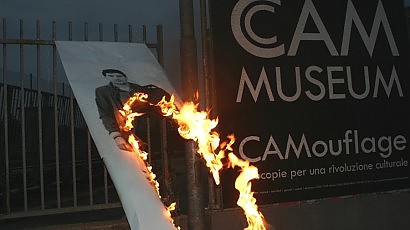 Subito ci avviciniamo allo schermo per guardare meglio e scopriamo che l’incendiario altri non è che il solito Antonio Manfredi, artista nonché direttore del CAM, Contemporary Art Museum di Casoria. Per nostra fortuna, il nostro buon Manfredi ha bruciato una sua opera ma una volta raggiunto dal microfono il direttore/artista si dice pronto a bruciare tutte le sue mille opere, una al giorno, per una giusta causa.