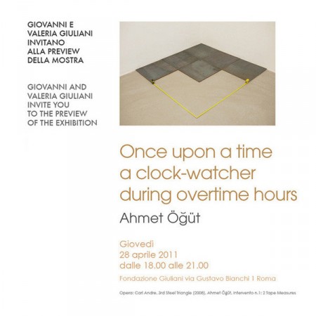 La Fondazione Giuliani di Roma inaugura il 28 Aprile 2011 la mostra personale di Ahmet Öğüt, Once upon a time a clock-watcher during overtime hours. Con spirito acutamente perspicace e tagliente, Ahmet Öğüt esamina le casualità quotidiane, i comportamenti e i gesti informali che testimoniano le più ampie strutture globali sociali e politiche. Attraverso l’uso di diversi mezzi espressivi, dall’installazione e la performance al disegno, al video, a interventi in spazi pubblici, Öğüt intreccia racconti che si dipanano tra pratica artistica e vita sociale per provocare consapevolezza critica e sottili slittamenti di prospettiva.