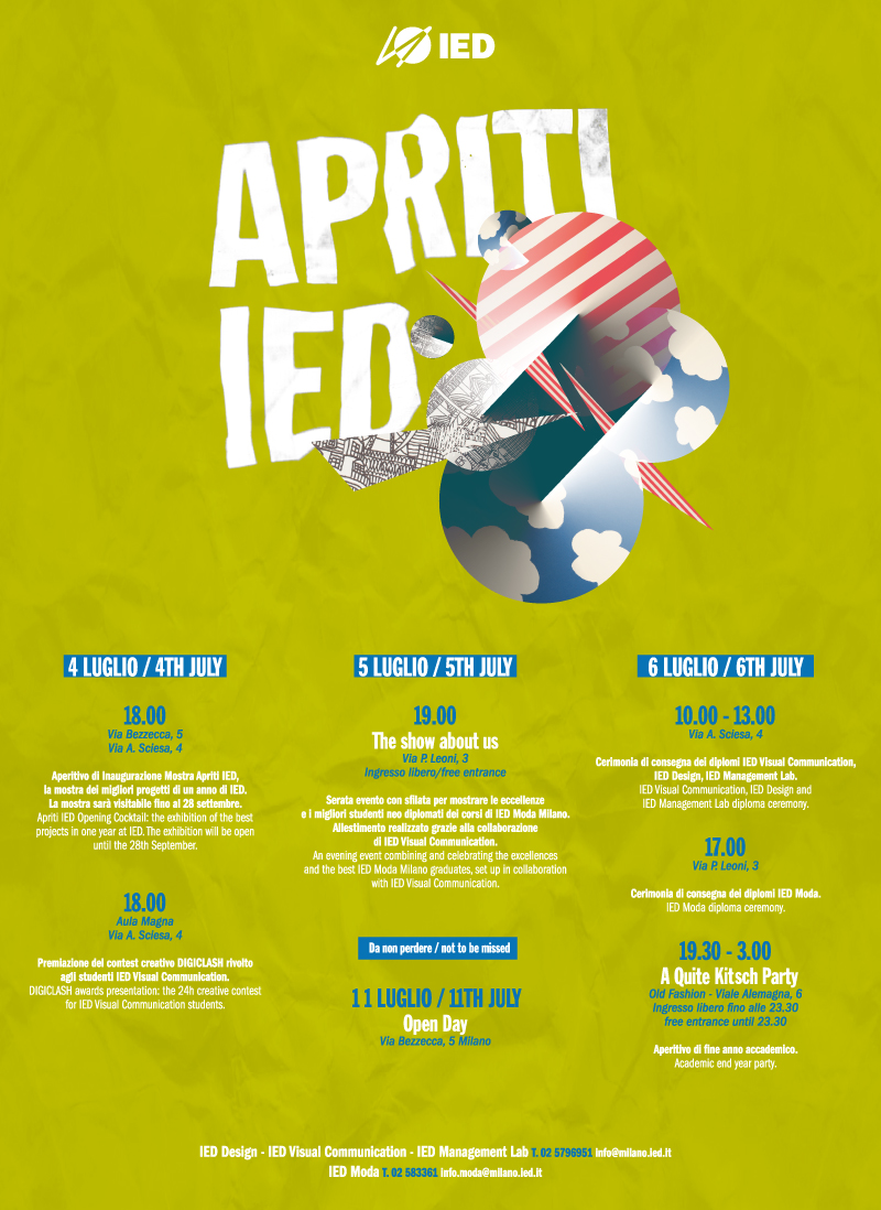APRITI IED è l’annuale appuntamento con cui l’Istituto Europeo di Design conclude l’anno accademico: tre giornate a porte aperte e un calendario di appuntamenti dove la creatività e il talento saranno i protagonisti. Da mercoledì 4 a venerdì 6 luglio le sedi di Via Bezzecca 5 e Via Sciesa 4 si trasformeranno in un villaggio creativo aperto al pubblico: quel luogo vissuto e animato da centinaia di studenti nel corso dell’anno diventerà teatro della loro crescita, della loro formazione ed esperienze, mostrandone i migliori progetti e parlando della loro vita, dei momenti di studio e allegria che hanno scandito un lungo percorso formativo, in un fermento di idee, creatività e talento.