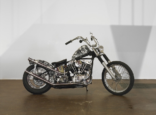 Come afferma l’artista stesso: Il wall painting è un lavoro che ho presentato più volte ed è per me sempre un’esperienza nuova, visto che è realizzato in ambienti e contesti diversi. Per me la pittura in generale è una sorta d’illustrazione o un tipo di decorazione e con la mia parete monocroma voglio realizzare un esempio più radicale di decorazione. La fotografia, invece, è un’immagine serigrafata di una motocicletta Harley Davidson. Anche se è una foto, per me si costituisce come una “scultura” perchè nasce da una “personalizzazione” di questo stesso oggetto.