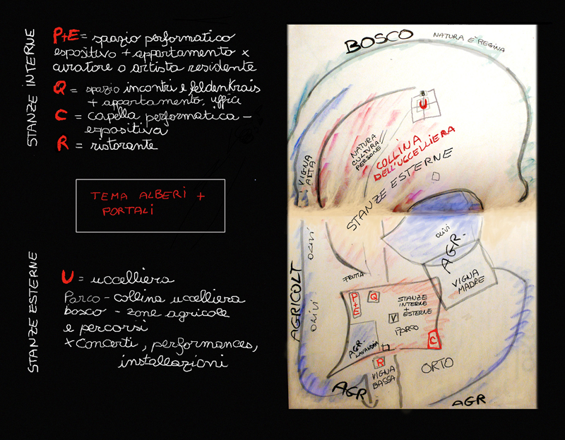 La percezione di questo paesaggio stimola la lettura della stratificazione del tempo, della sedimentazione dell’azione umana, della complementarietà e interazione di natura e storia. In particolar modo, lo spazio della Tenuta Dello Scompiglio si articola attraverso una serie di portali accennati che cadenzano il paesaggio, modulano gli spostamenti e tracciano molteplici percorsi e zone di transizione fra il bosco, l’agricoltura e l’architettura paesaggistica. Una successione di portali, configurati secondo esigenze contraddittorie e a volte conflittuali tra l’equilibrio della natura e gli interventi funzionali all’attività umana, sia essa colturale o culturale, che si vogliono evidenziare attraverso installazioni di arti visive in grado di leggere e interpretare la loro disposizione.