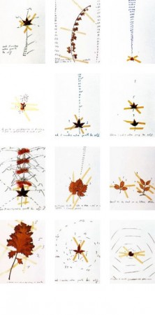 In questa occasione verranno esposte due serie di opere su carta di due protagonisti dell’Arte Povera. Le 14 tavole che compongono il ciclo Da un erbario raccolto nel 1979 in Woga-Woga, Australia, realizzato da Merz nel 1989, accostano a diversi esemplari di foglie di piante (su cui l’artista interviene come suo solito con lo scotch) la numerazione tipica della successione di Fibonacci.