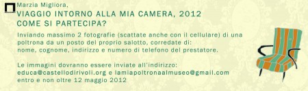 Ai cittadini del territorio è richiesto di diventare prestatori, nella modalità propria dell’arte, di un oggetto personale, ovvero una poltrona da un posto del proprio salotto. Le poltrone selezionate, saranno ospitate temporaneamente al Museo, entrando in relazione con le opere della collezione. Il prestatore, cede temporaneamente e in modo anonimo un oggetto personale e d’uso quotidiano, per condividerlo con la collettività; prestare qualcosa di proprio mettendolo a disposizione di altri è simbolo di una presenza partecipata.