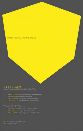 Palazzo Collicola Arti Visive partecipa alla Settimana della Cultura con l’inaugurazione di SECONDAVERA, la nuova stagione espositiva del Museo spoletino in un dialogo costante tra territorio, arte e cultura. SECONDAVERA 4 esposizioni personali Fabrizio Campanella . Virtualismi EPVS . Play Walter Gasperoni . Disegni Carlo Moggia . 1962 @ 2012 @ Futuro 3 Collicola on the Wall Luca Barcellona . La scrittura ricodifica la pittura Danilo Bucchi. Il segno diventa narrazione Alberto di Fabio. I paesaggi della mente (volume due)