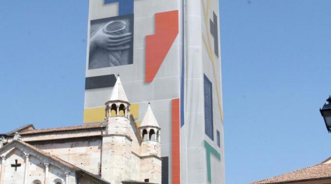 C’era una volta un grande telo, uno di quelli usati per coprire le brutture causate dai lavori di restauro. Parliamo di un telo molto grande, circa 64 metri di lunghezza e 14 d’altezza. Questo telo si trovava a Modena, per circa quattro anni ha ricoperto il cantiere della Ghirlandina, divenendo un vero e proprio simbolo cittadino. Ma non si trattava di un telo comune, perché questo telo era in realtà un’opera d’arte creata dal grande Mimmo Paladino.