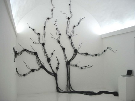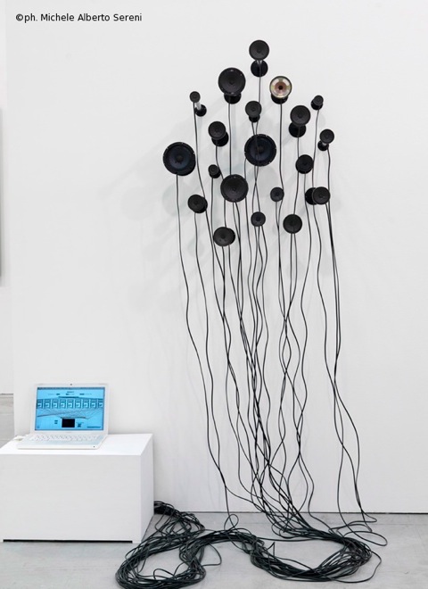 L’evento in questione è Ivy Noise progetto di Daniela ddm Di Maro & Roberto Pugliese curato da Mara De Falco, in mostra dal 17 aprile al 21 maggio alla Akneos Gallery. Il lavoro presentato dal giovane duo è costituito da un’installazione che si allunga sulle pareti dello spazio espositivo formando un perfetto intreccio di cavi elettrici alle estremità dei quali sbocciano come oscure gemme sonore una moltitudine di speakers conici di varie dimensioni.