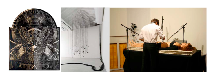 Ci introducono nel percorso le tavole incisorie di Alessandro Fornaci (Roma, 1974; dove vive e lavora), dense di simboli e di segni ancestrali, più o meno ri-visitati, ri-considerati, ri- significati nella concezione universalistica di un presente infinito, dove passato remoto e futuro si muovono lungo la linea ciclica di un’eterna replica, nel teatro della realtà. Poco oltre le rappresentazioni grafiche dei cinque sensi nobilitati nei cinque solidi platonici – perfezione e bellezza – chiusi in una simbologia prorompente che affonda nell’astrologia, nell’alchimia, nella quintessenza. Ad impreziosire la ricerca di Fornaci è una performance dimostrativa delle sperimentazioni tecniche effettuate per ottenere, tramite vibrazioni sonore da fonti differenti, nuovi processi di stampa.