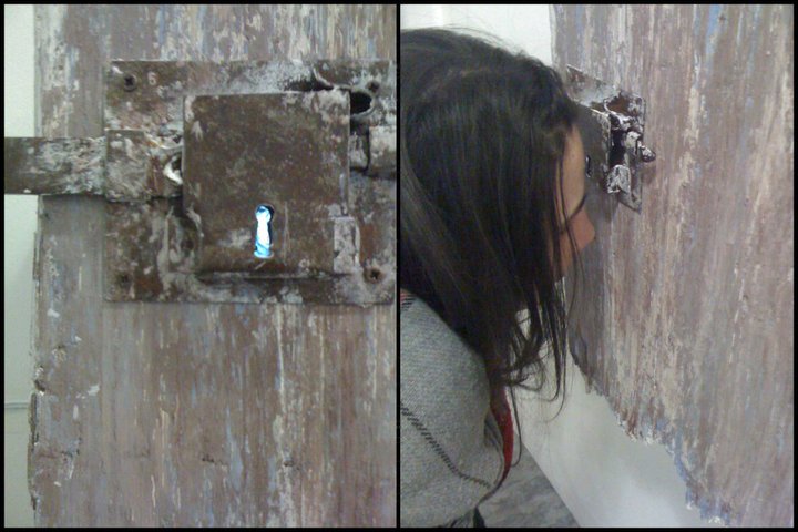 Un brandello di porta con la toppa. Un buco di una serratura da cui guardare o spiare. È così che l’opera di Roxy in the box si presenta al pubblico. Ma è proprio questa (apparente) semplicità che cozza col contesto e col titolo stesso del lavoro. Perché l’opera era esposta nella mostra Achtung! Achtung! (svoltasi a Roma – Ex Gil, 13 -27 gennaio 2011 organizzata in occasione della ricorrenza della Giornata della Memoria) e il titolo è Olocausto.