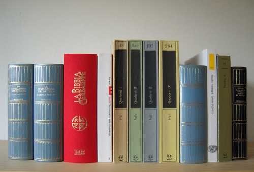 Ogni libro trova la sua forma o immagine più consona in base al proprio contenuto, e allora le pagine dei testi buddisti diventano una ruota, le pagine della Genesi svelano un piccolo pianeta, le righe di Alchimia si trasformano in una sorta di alambicco, le frasi di Zhuang-zi si illuminano, le lettere tra Arendt e Heidegger sono ricamate, i Quaderni di Simone Weil vengono copiati a mano e le sovra-copertine di lana sono lavorate a mano, Teoria e pratica della non-violenza farà da schermo per una piccola videoproiezione in cui l’immagine poggia sul testo e, infine, Il giuoco delle perle di vetro diviene una combinazione di perle in cui ciascuna perla è formata delle righe di una pagina del romanzo.