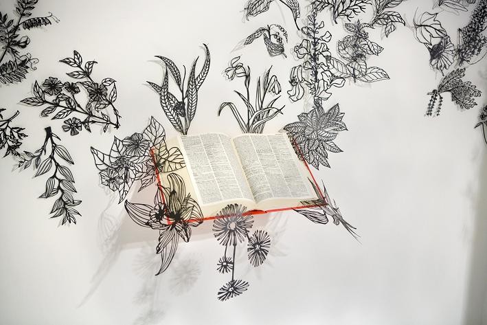 Sabrina Mezzaqui, in occasione della sua quarta personale presso la Galleria Minini di Milano<dal 23 gennaio, attinge a diverse tradizioni filosofiche, religiose, letterarie per impostare una mostra-biblioteca. Tutti i lavori presentati nascono infatti da libri che l’artista ha letto e reinterpretato. Le modalità di elaborazione e manipolazione dei volumi in mostra sono quelli che l’artista ci ha, negli anni, insegnato a riconoscere come segnali essenziali della sua poetica: ritagli delle righe di testo, forme di origami utilizzando le pagine dei libri, copiatura manuale degli scritti, ricami.
