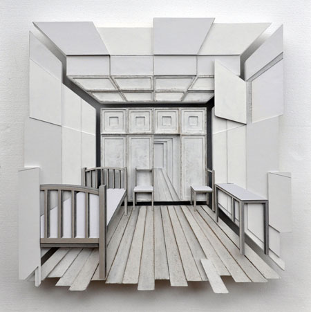 COSA: In mostra nello spazio sotterraneo della galleria la nuova produzione dell’artista. Elementi fondanti del lavoro sono l’idea di Assoluto, il luogo fisico, la prospettiva, la trasparenza e le nostre capacità percettive. Sculture a parete da appendere con cornici di legno e mandala di filo intrecciato all’interno, enormi costruzioni appese al soffitto contengono spazi immaginari come porte su altri mondi, rilievi di stanze in cartoncino che diventano equilibrate geometrie.