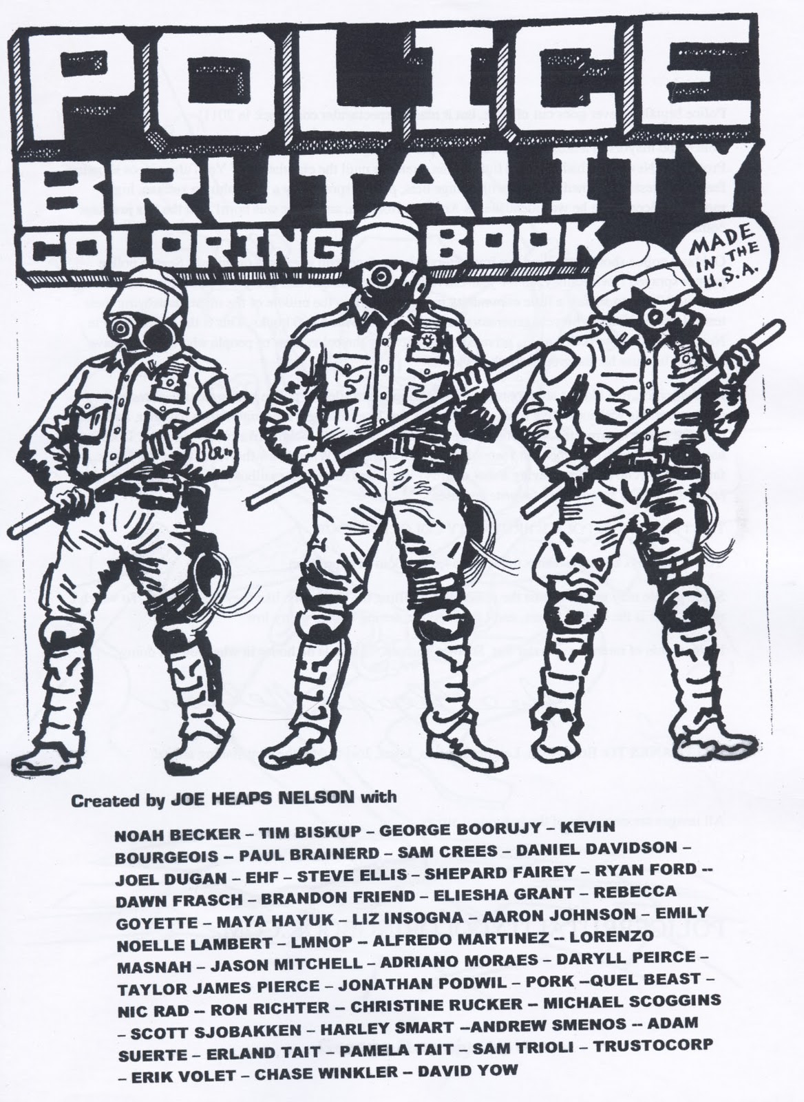 Si tratta del Police Brutality Coloring Book, un libro da colorare (proprio come quelli che si comprano ai più piccoli) dove sono raffigurati gli atti di ritorsione innescati dalla polizia ai danni del movimento newyorchese. Al libro da colorare hanno partecipato 46 artisti, tra cui spiccano i nomi di Shepard Fairey e Tim Biskup. L’idea è sorta all’indomani di un duro attacco compiuto dalla polizia in quel di Zuccotti Park con largo uso di spray al peperoncino e botte da orbi. L’ideatore del progetto, l’artista Joe Nelson, ha quindi deciso di contattare tutti i colleghi di sua conoscenza ed organizzare un meeting proprio in Zuccotti Park per sensibilizzarli sull’accaduto ed informarli sul progetto di artist’s book.