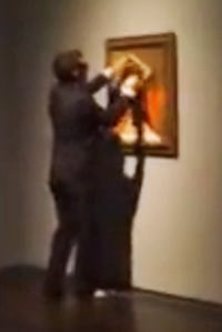 L’intero incidente è stato filmato da un testimone munito di telecamera che ha poi postato il tutto su youtube. Nel video è possibile vedere l’attentatore che alza le mani sul dipinto e applica lo stencil incriminato. Attualmente la polizia sta compiendo delle indagini per venire a capo dell’intera storia.