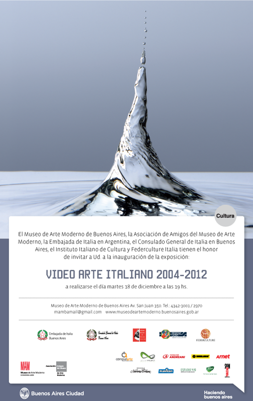 Il MaMba, Museo d’Arte Moderna di Buenos Aires, il Ministero della Cultura della Città di Buenos Aires, e gli Amici del Museo d’Arte Moderna di Buenos Aires, in collaborazione con Federculture Italia e Ambasciata d’ Italia in Argentina, il Consolato Generale d’Italia a Buenos Aires e l’Istituto Italiano di Cultura, ha l’onore di presentare la mostra: Video Arte Italiana 2004-2012 curata da Micol Di Veroli, Giovanna Sarno e Massimo Scaringella e prodotta da Federculture Italia Mamba, Buenos Aires (Argentina).